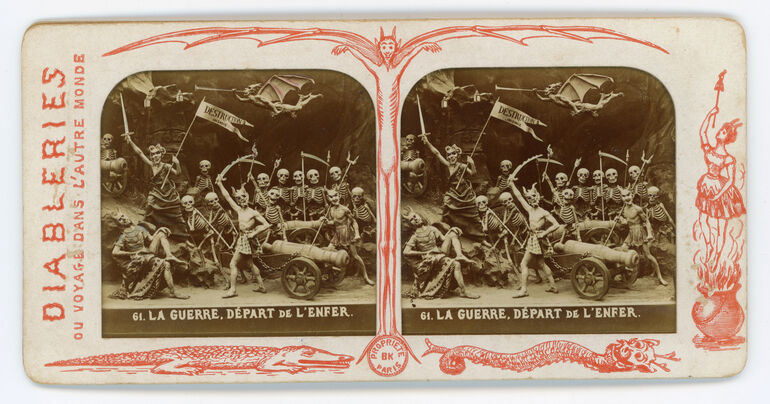 Stereoscopy also revealed a light-hearted and playful side of Victorians. The final thematic section of the show, Fantasy, reveals how photographers would use fancy dress, staging and props to create imaginative scenes to delight and intrigue. Tableaux of skeletons and devils, known as Diableries, and ghostly apparitions show a darker side of Victorian humour.