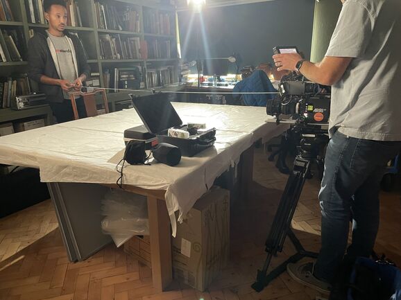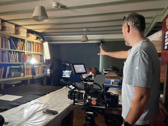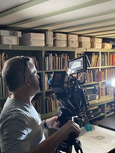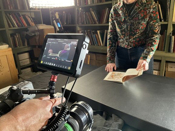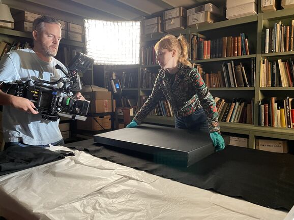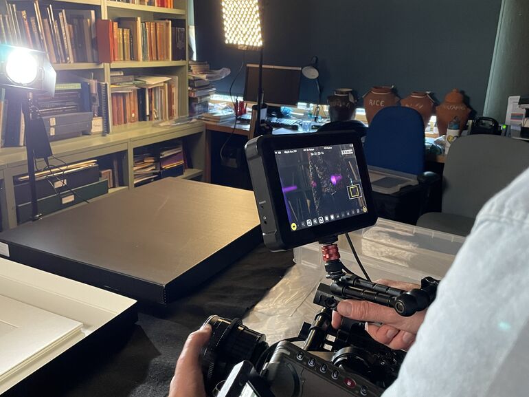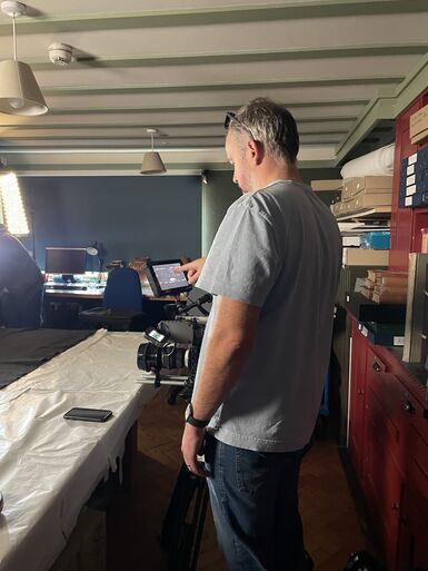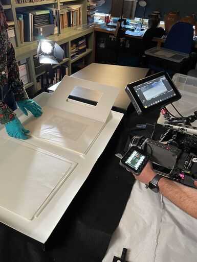 Then it was time for filming! Adam began with some over-the-shoulder footage of Sarah Mercer handling the artworks, using a very heavy camera.