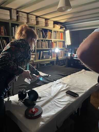 The first step in the process is to set up all the equipment. This involves measuring the distance between the subject and the camera to make sure everything is in focus, setting the lighting, and framing the camera. Another important step when filming and photographing old artworks is to check the lighting levels. This is because old pigments can be sensitive to the light, and lights that are too bright can damage the artworks. To make sure the lighting is at a safe level for the works, Sarah uses a nifty device called a Lux Meter, which measures the amount of light which an object is exposed to.