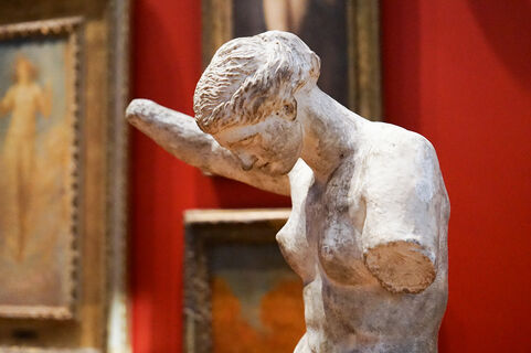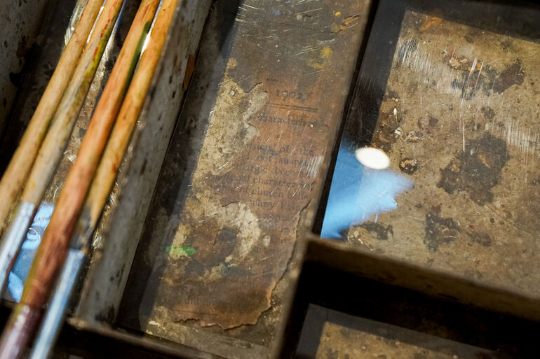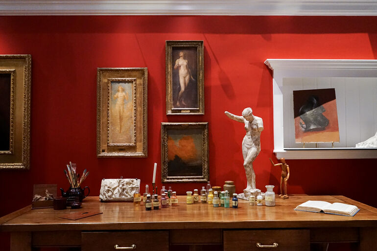 When cleaning artworks and objects, you get the opportunity to get up close and see them in much more detail than usual. This is useful for collections care, as it allows us to check on the object's condition whilst on display and spot any issues. Sometimes you'll spot something interesting, like a fragment of newspaper from 1902 which Sarah spotted in George's paint table. We also noticed some words etched into G F Watts's plaster cast of a chariot horse from the Parthenon, which is placed on the mantelpiece. Finally, we spotted the title of the Mary Watts' ornate fireplace, Love and Life, carved into the lower left corner. This was also the theme of a number of works by G F Watts, including a painting displayed nearby. See if you can spot these hidden details on your next visit.