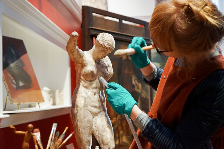 It's important to use the right tools and materials when working with artworks and sculptures to help preserve them. A soft goat-hair brush is reserved for the gilded frames of Watts's paintings, which have extremely fragile surfaces. Slightly stiffer, hog-hair brushes are used for dusting the furniture and sculptures. The metal on the brush is covered with tape to prevent it from scratching.