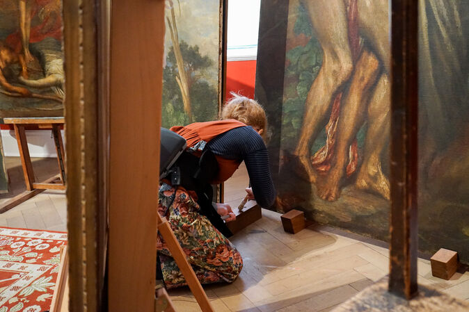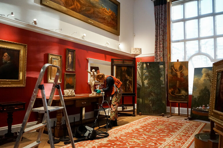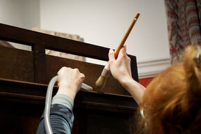 Much like any building, particles from upholstery, rugs and people's skin and clothes accumulate on the surfaces over time. Cleaning must be done carefully and as minimally as possible, to balance the risks posed by dust with the disturbance that cleaning can cause. Dust attracts insects into our spaces and provides food, which can lead to damage. Over time, it can cause objects to lose their vibrance and obscure their details. To remove it, Sarah uses a selection of different natural-hair brushes, gently sweeping their surfaces. She uses a vacuum cleaner with variable suction and a long hose, covered with a piece of gauze fabric. This allows her to catch dust as soon as it is disturbed with the brush, preventing it from settling on other surfaces. The gauze prevents larger fragments from being sucked into the vacuum cleaner.