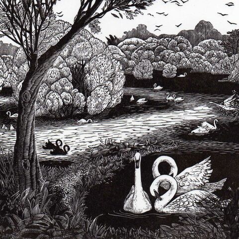 She later wrote how she found “a positive sensual pleasure in cutting through the silky surface of the darkened block into the crisp boxwood. I loved the satisfying crunch as the scorper lifted little golden curls on its way through the wood to create light in which the composition was slowly revealed… I still delight in the rich and varies textures that can be created, the sparkling clarity of the cleared white areas and the deepest black of any print medium.”