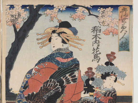 Utagawa Kunisada (1786 - 1865) 歌川 国貞, Three Senior Oiran on Parade in the Yoshiwara, Edo, (detail), 1853, colour print from woodblocks.