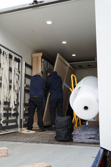 Once all the work was finished on the frames, the glass was fitted and they were ready for packing up. Art handlers Gander & White came to pack the works and get them on their way to Italy. The paintings were first wrapped in a layer of tissue, then a plastic wrap, before being carefully placed into custom-built travel crates that fit them perfectly.